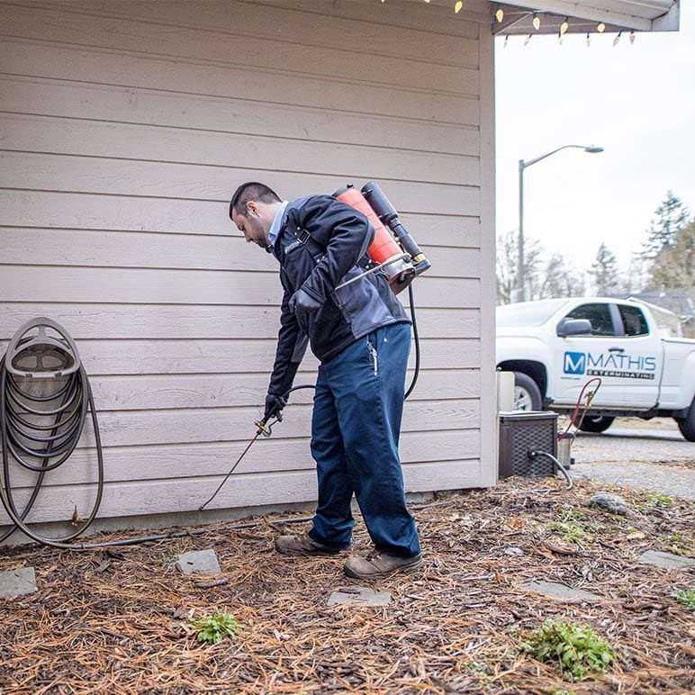 A person wearing a backpack sprayer is applying pest control treatment along the base of a building. There's a hose coiled on the wall, and a white truck with a visible company logo is parked nearby.