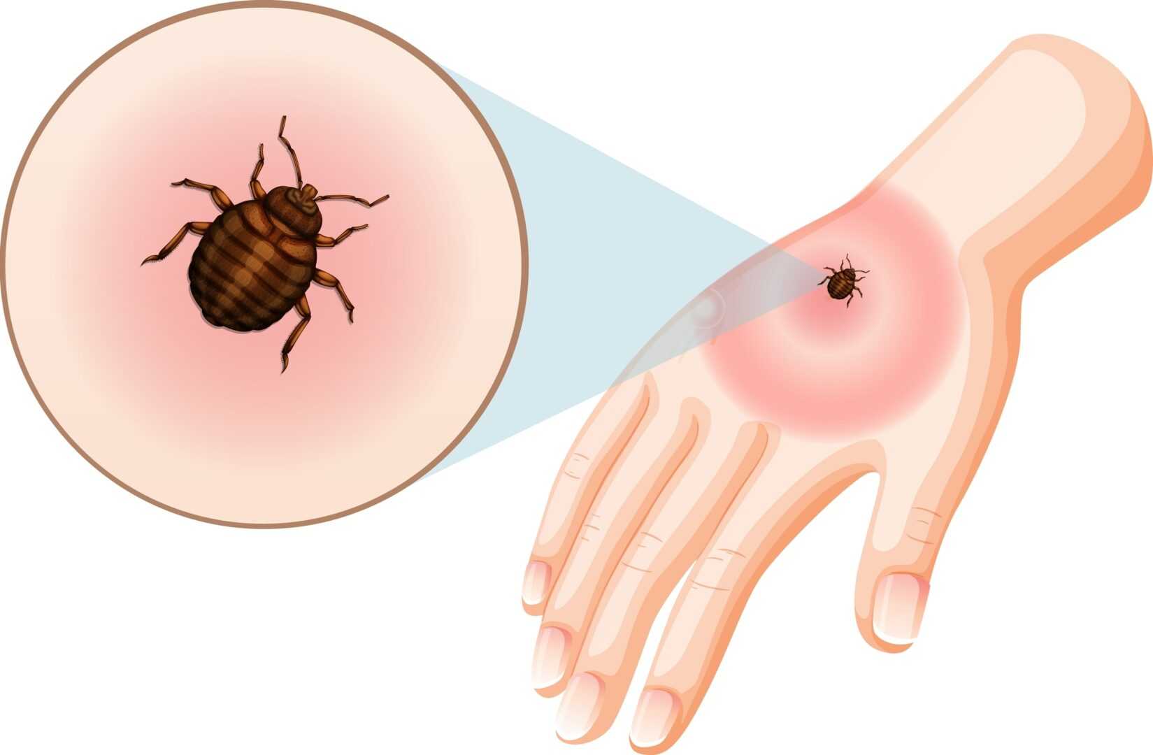 Illustration of a bedbug biting a human hand, causing a red, swollen area. The image includes an enlarged circle for detailed bed bug identification, highlighting its intricate features and bite symptoms.