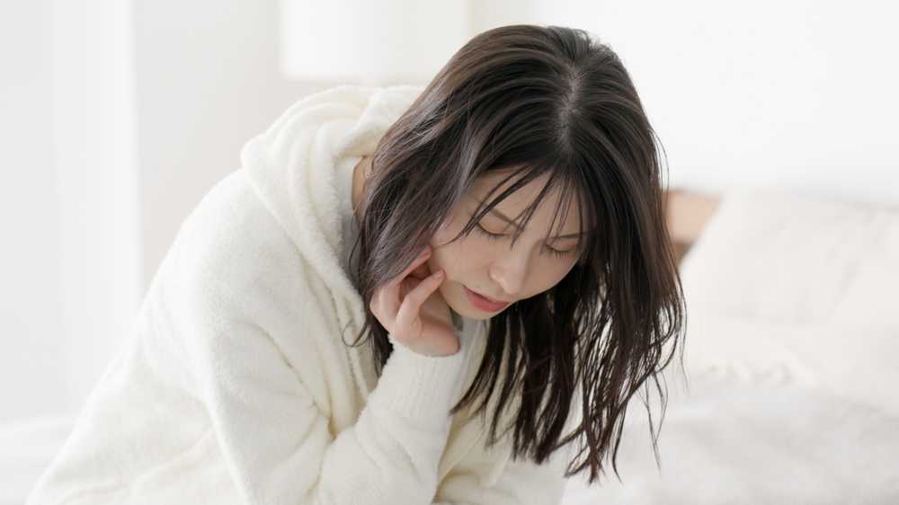 A woman with long dark hair wearing a white hoodie sits on a bed, appearing deep in thought or feeling unwell. Her head is tilted slightly downward, and her hand rests on her chin, possibly contemplating bug bite symptoms. The background is softly lit, adding to the contemplative mood.