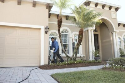 A person in a blue shirt is using a leaf blower to clear debris from a landscaped area beside a modern house with arched windows, ensuring it's pristine and termite-control ready. There's a garage door on the left and two palm trees near the entrance.